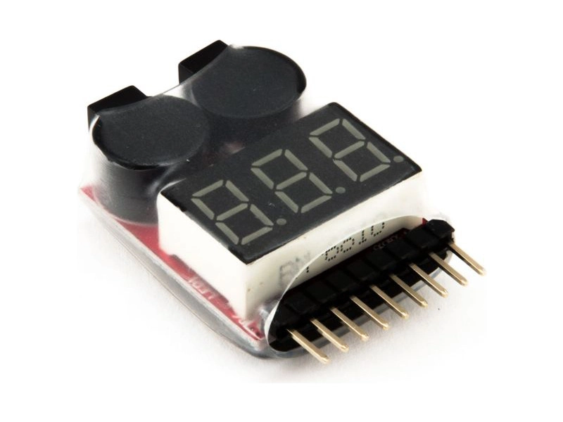Tester 1 až 8 článkových LiPo/LiFe/LiIon/LiMn akumulátorů s nastavitelným zvukovým alarmem. Měří napětí celkové sady a poté samostatně napětí jednotlivých článků. Konektor má rozteč pinů 2.54 mm, je kompatibilní s většinou servisních konektorů včetně JST-XH.