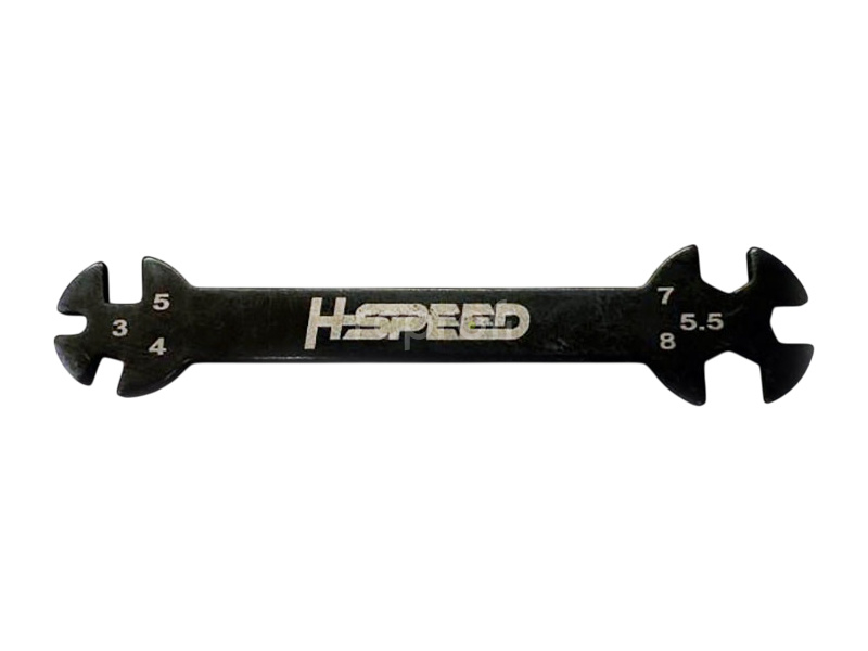 Multifunkční ocelový plochý klíč otevřený na šestihranné hlavy 3/4/5/5.5/7/8mm s černěným povrchem a logem H-speed. Délka 120 mm.