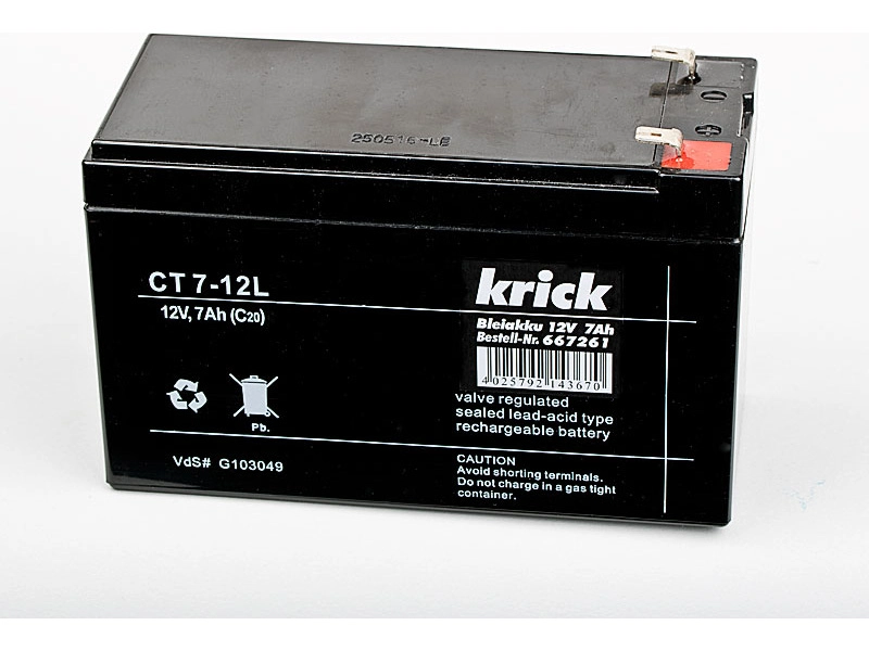 Krick Olověný akumulátor, napětí 12V kapacita 7Ah, rozměry 65x100x161mm, hmotnost 2540g. Nabíjení 0,2C