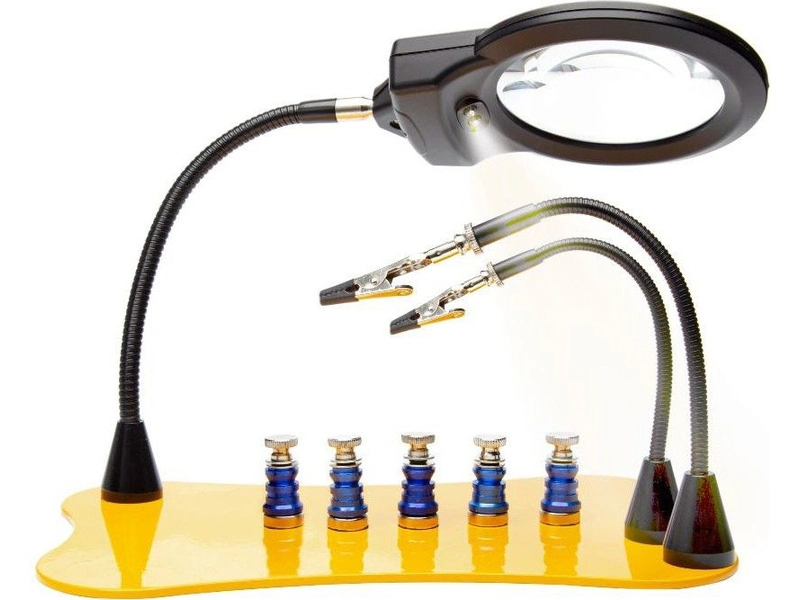 Modelcraft pracovní stanice pro pájení sestává z masivní tuhé základny, stabilních flexibilních ramen s výkonnými magnety, které bezpečně drží na místě, a krokosvorkami s gumovými kryty pro ochranu citlivých částí. Vestavěná lupa s LED světlem. Odnímatelná a přemístitelná ramena a svorky. 5 příchytek s magnnnety.