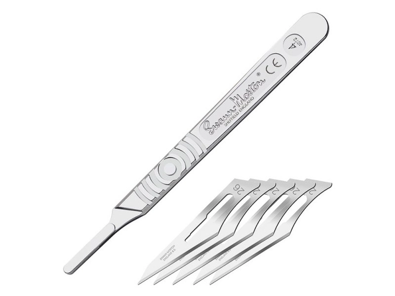 Profesionální skalpel Swann Morton s rukojetí z nerezové oceli, držákem čepelí varianta #4 a s pěti čepelemi z uhlíkové oceli typu #26A. Jedná se o precizní nástroj pro modelářské, řemeslné a výtvarné činnosti na řezání, vyřezávání, škrábání a rýsování materiálů jako je papír, karton, kůže, fólie, plasty, akrylát, balza a další. Do rukojeti lze nasadit čepele různých tvarů ostří pro specifické potřeby, viz. příslušenství.