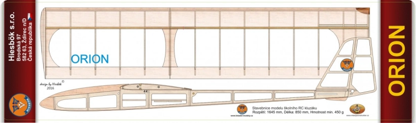 Stavebnice školního RC modelu Orion s profilem křídla řady AG a jednoduchou robustnější konstrukcí.