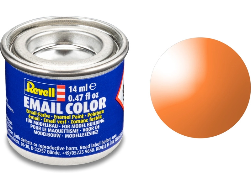 Syntetická (emailová) barva Revell 32730 pro použití v modelářství. Odstín číslo 730 – oranžová transparentní. Obsah 14 ml.