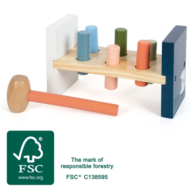 Tato motorická klasika vyrobená z certifikovaného dřeva FSC® přináší do dětského pokoje radost z klepání. Dřevěná hra zatloukačka vybízí děti, aby si vyzkoušely svou sílu tím, že pomocí kladívka zarazí dřevěné válce vyčnívající z lavice. Jakmile jsou všechny válce dole, lavici lze snadno převrátit a zábava začíná znovu. Boční potisk ledního medvěda odrážejícího se na vodní hladině také dává vizuální smysl, když je lavice obrácena a hraje se vzhůru nohama. Skvělá zábava pro všechny malé siláky. Hra, která hravě ilustruje principy příčiny a následku. Trénuje koordinaci ruka-oko a motoriku. Moderní barevné provedení v jemných arktických barvách dělá z motorické hračky dekorativní poutač.