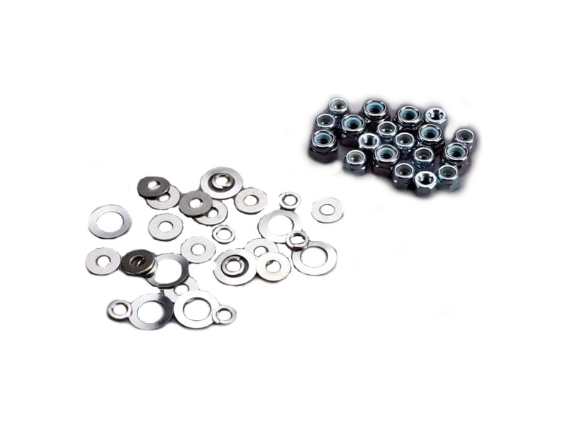 Náhradní díl pro RC modely aut Traxxas: sada 11 ks samojistných matic M3 a podložek 3mm a 7 ks samojistných matic M4 a podložek 4mm.