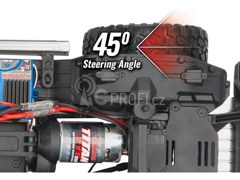 Zatáčení předních kol je možné o úhel 45°, řízení je zajištěno servem Traxxas 2075X s kovovými převody. Díky novému šasi dosáhl model skvělého nájezdového úhlu.