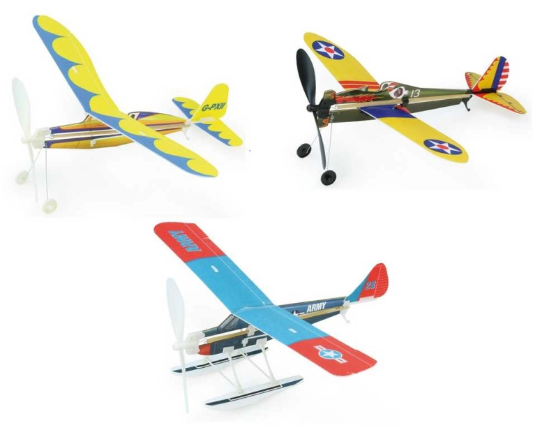 Letadla s natahovací vrtulí – dá se natáhnout gumičkou. Na výběr ze 3 typů letadel, např. Boeing P-26 nebo Beaver.